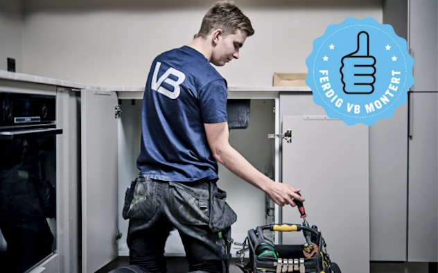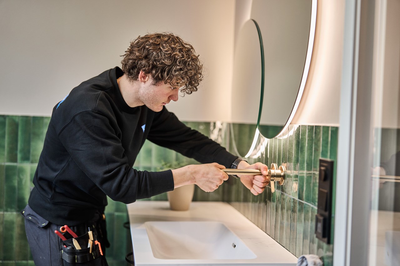 Baderom med servant og servantskap montert på beige flislagt vegg med skap i matchende mønster. Rørlegger i arbeidsantrekk i bevegelse ut av bildet.